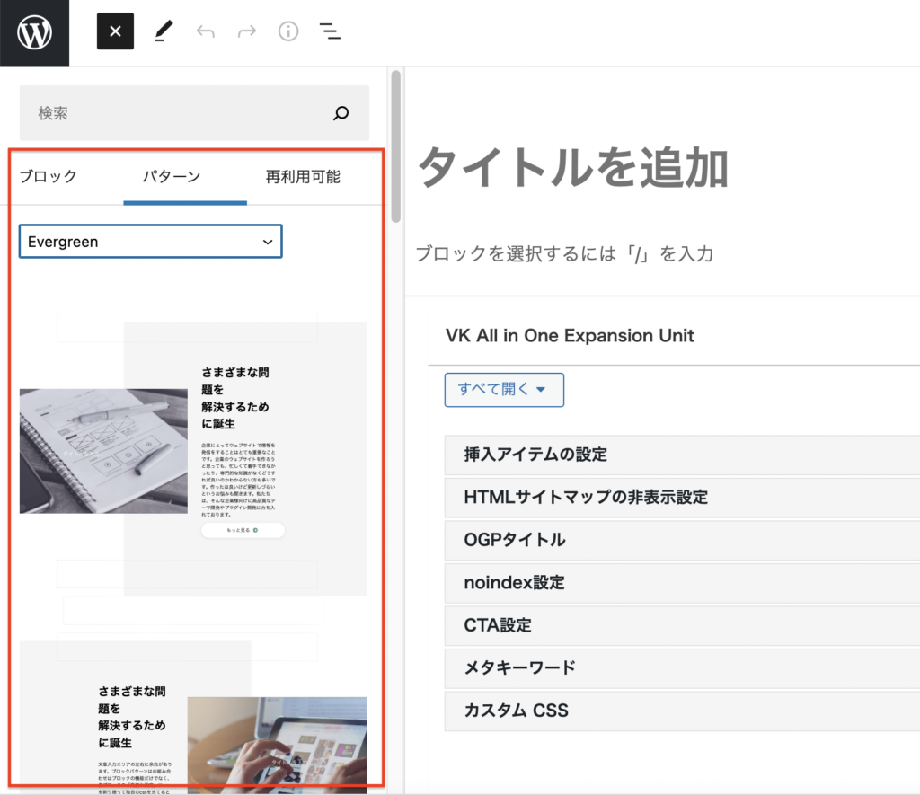 文章入力エリアの左右に余白があります。ブロックパターンはの組み合わせはブロックの機能だけでなく、各ブロックの「高度な設定」にcssを割り振って独自のcssを当てるとデザイナーさんがいろいろと力を発揮できる分野ではないかなと思います。